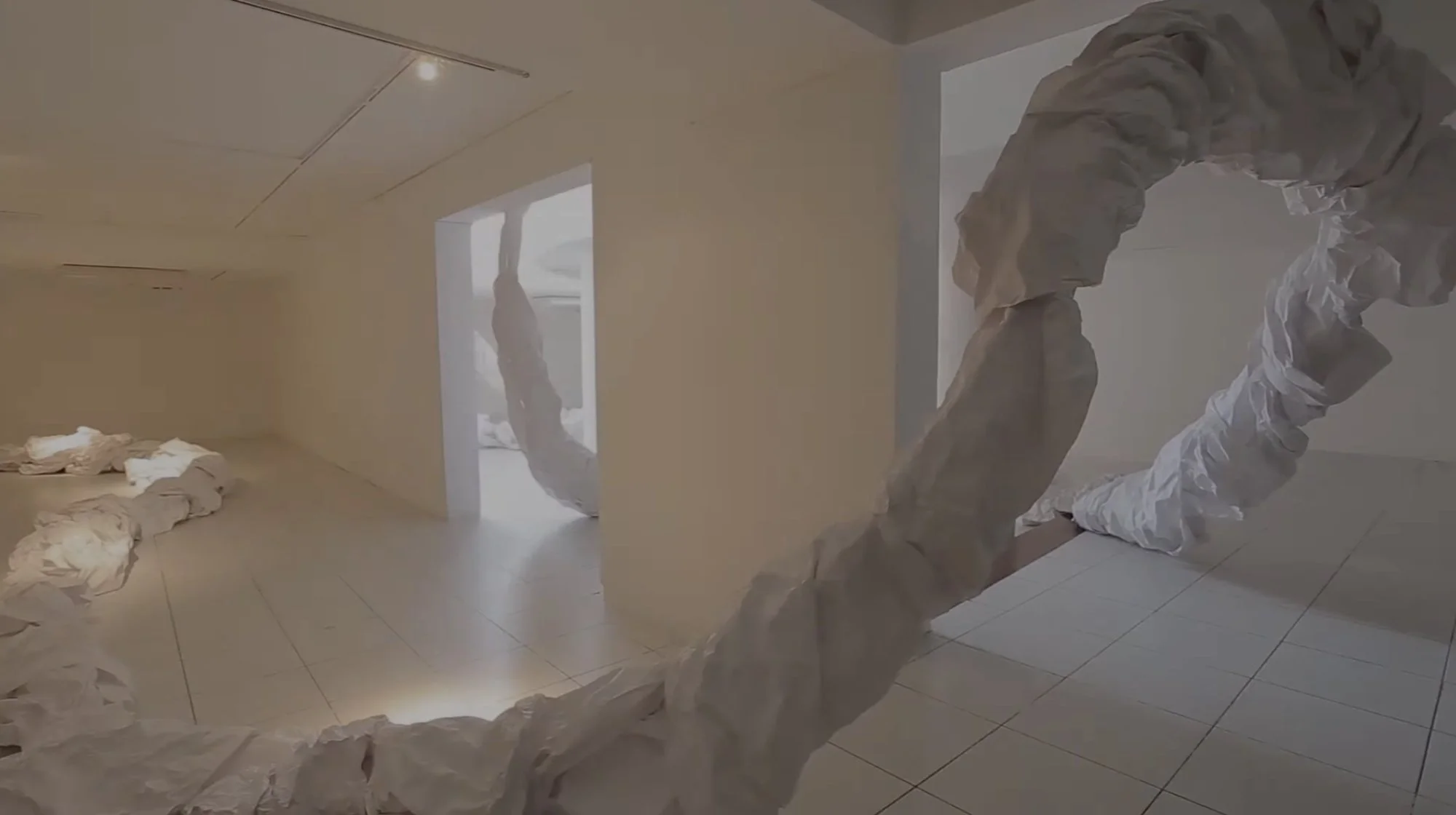 “Una corriente de papel recorre las salas 770 y Raúl Porras Barrenechea del C.C. Ricardo Palma. Sus contorsiones y retorcimientos hablan de la memoria, del presente y del devenir, pero también de la muerte, un tema que no es ajeno a la obra del artista peruano.”